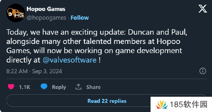 据《雨中冒险》系列开发商Hopoo Games社交平台连发三条消息,表明自己目前已经加入Valve,为V社开发游戏。