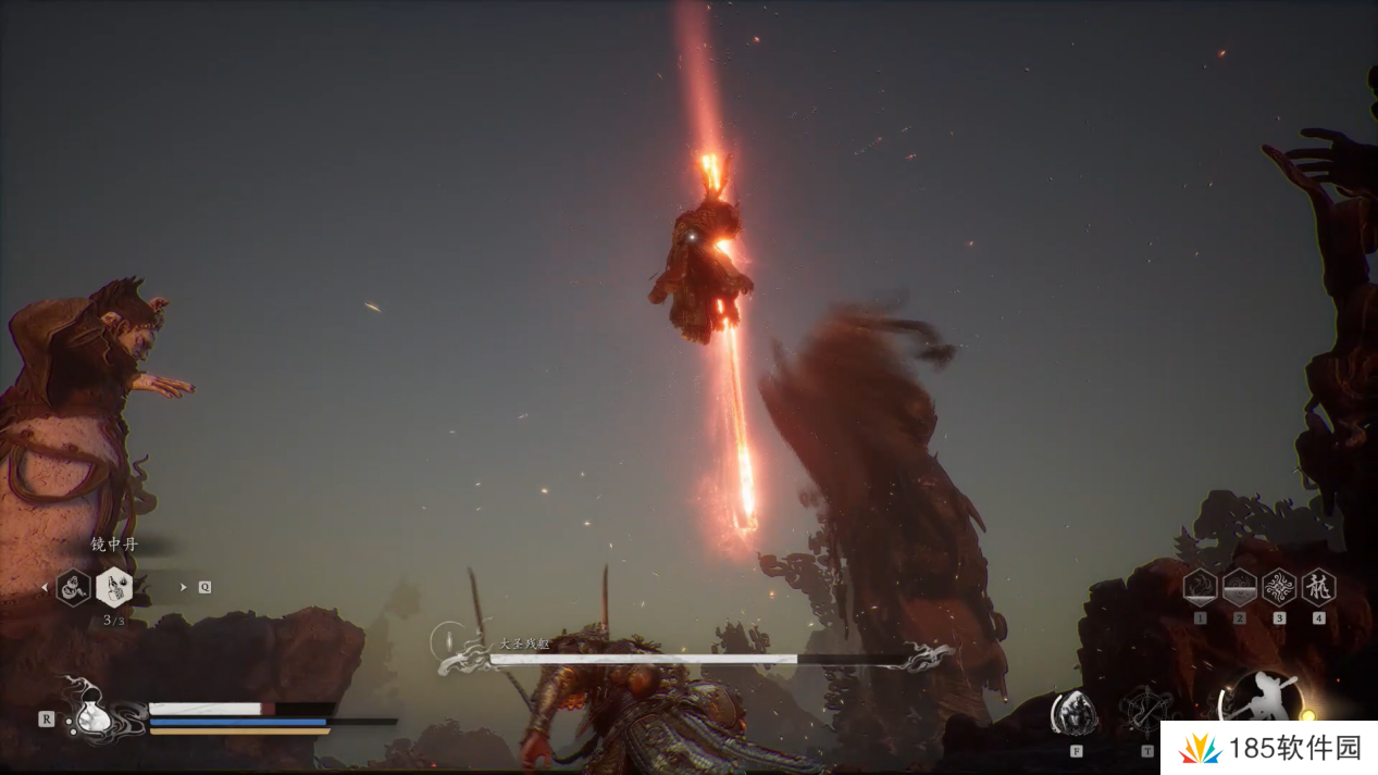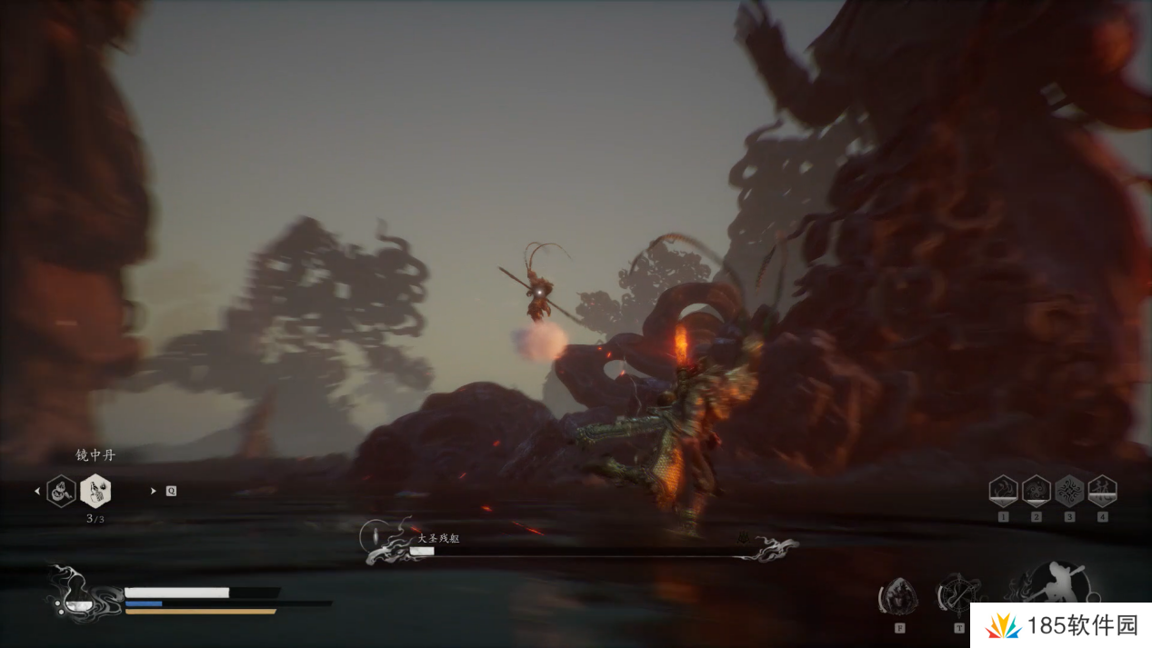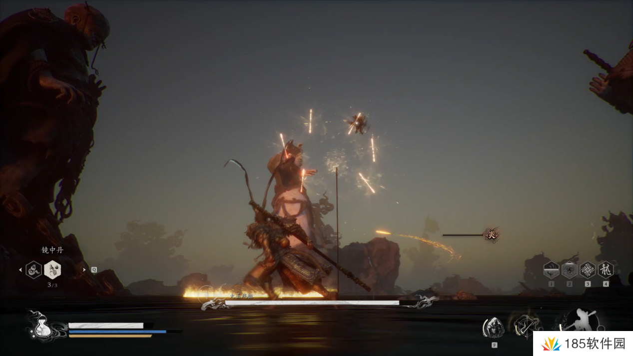 大圣的轻攻击与我们几乎一样,但是棍子更长,且它还会翻滚,小编建议此时我们就不停移动不要靠近猴哥,用四段棍式的长距离攻击消耗即可,并且多保留一点血瓶和法术值作二阶段的最终决战。