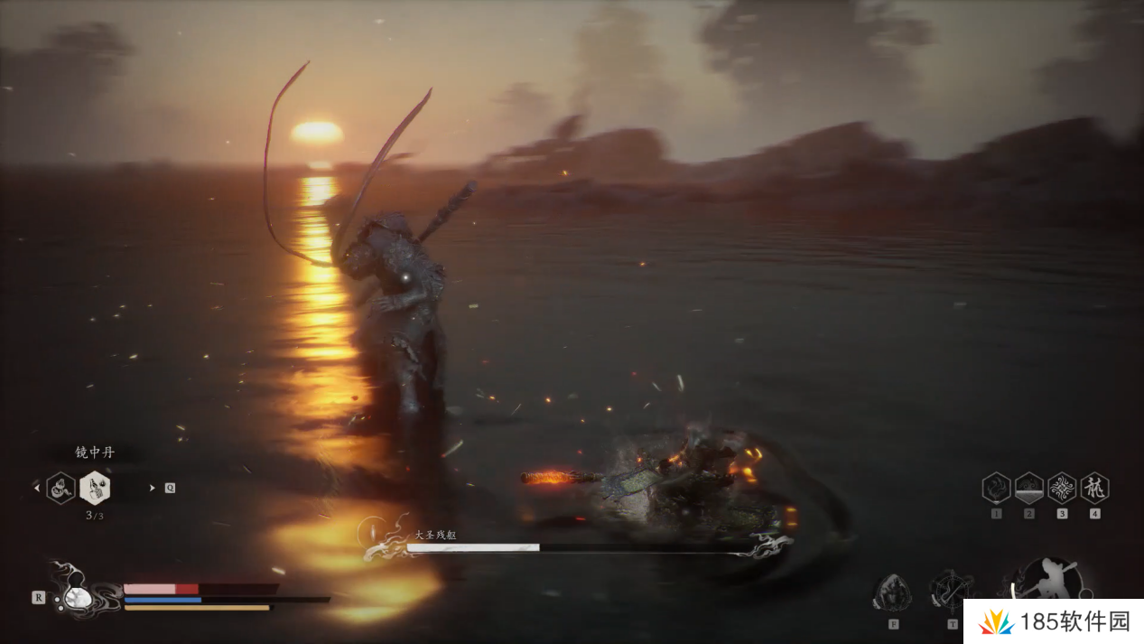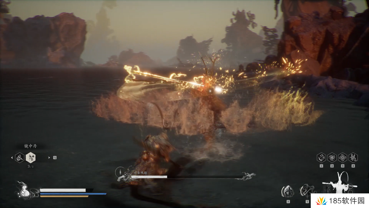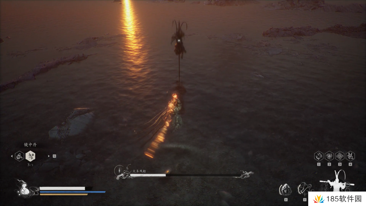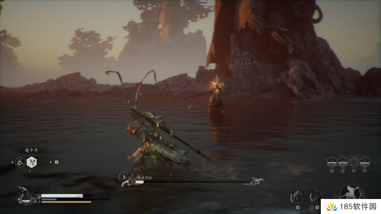 大圣的轻攻击与我们几乎一样,但是棍子更长,且它还会翻滚,小编建议此时我们就不停移动不要靠近猴哥,用四段棍式的长距离攻击消耗即可,并且多保留一点血瓶和法术值作二阶段的最终决战。