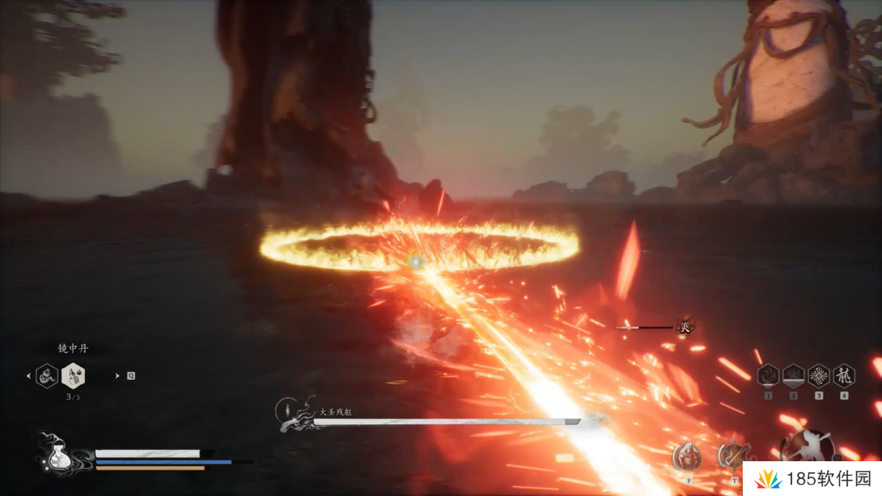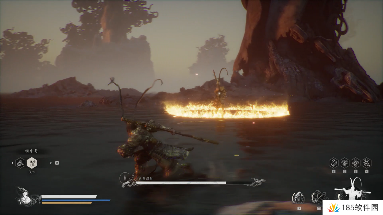 大圣画地为牢,画出的安身法是我们的几倍,我们靠近火圈就会受到伤害,等他出了安身法后再寻攻击的时机,或者使用四段的大范围劈棍中距离攻击。