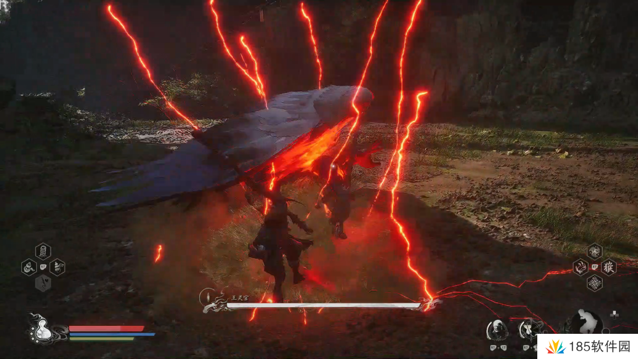 在这个阶段我们使用棍式,还是能打出很多次王灵官的硬直,注意它的几招快速攻击(飞踹、金鞭等),通过定身和棍式能够打出大量伤害。