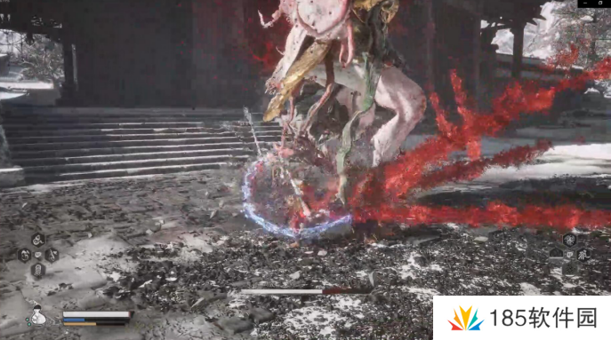 跺脚顾名思义,会抬脚在地上放出中等距离的冲击波,能破玩家霸体状态,不吃铜头铁脑的弹反硬直。血流追踪是从他身体里射出的大约20道血色液体状追踪物,伤害较高。