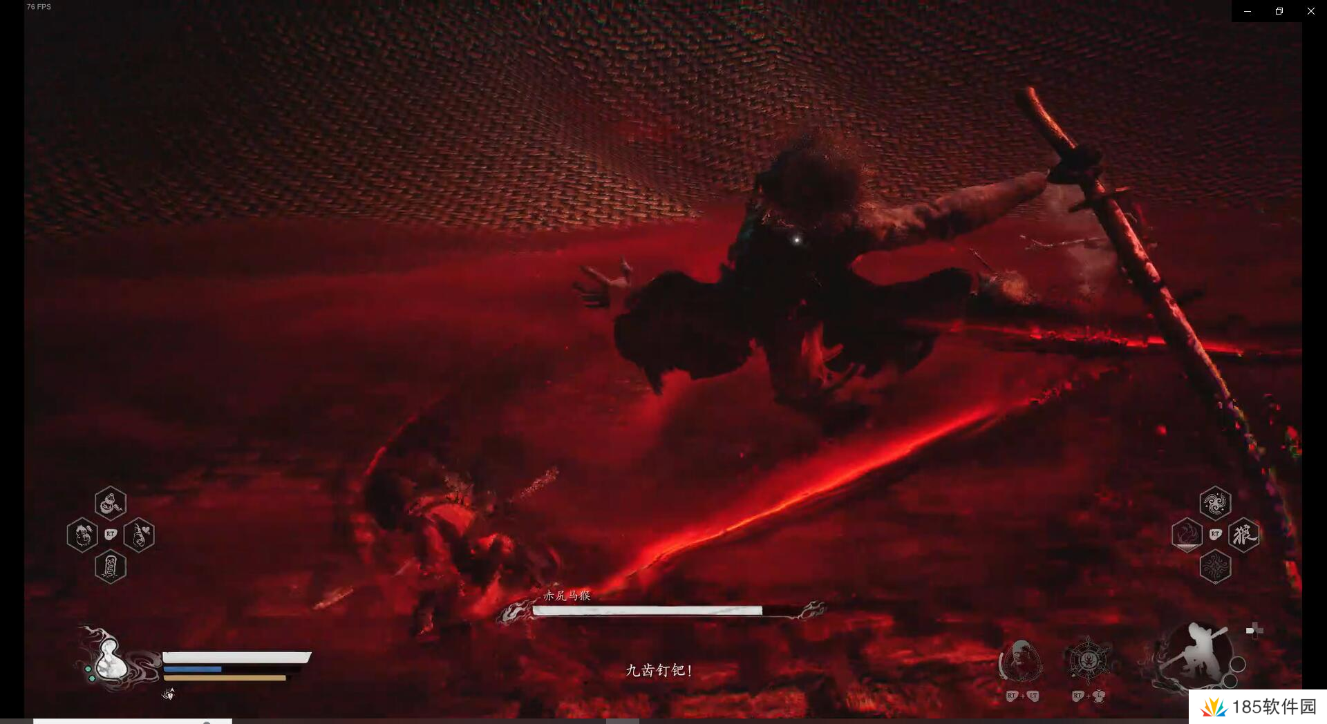 此状态发生在黄眉的boss战中场阶段。我们会被吸到黄眉的法宝中,与已经彻底妖魔化的马猴展开战斗,这个阶段的马猴刀上附着血光,攻击距离增加了50%左右,并且会用部分法术。