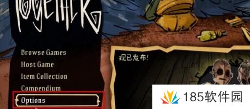1、首先玩家打开饥荒联机版,初始界面是英文,点击游戏界面左上角的Options进入设置页面;