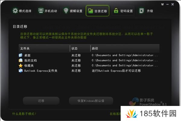 4、使用方法:请进入正常模式,打开影子系统软件,选择目录迁移功能