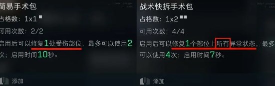 这类影响作战能力的异常状态,即便没有持续造成健康值下降,也需要尽快使用手术包修复。当然手术包也分为好几种。简易手术包启用后可以修复1处受伤部位,且最多使用两次。品质更好的手术包,则可以同时修复1个部位上的所有异常状态,使用次数也更多。