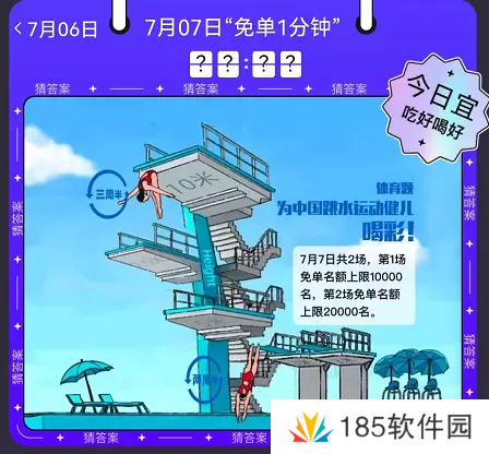 今天小编给大家带来的是饿了么免单一分钟7.7的答案详细介绍,今天的题目和昨天的题目相比之下就明显简单了很多,也很好猜测准确的免单时间了。今天的题目和跳水运动有关,那么就让小编来给大家带来准确的预测时间吧。