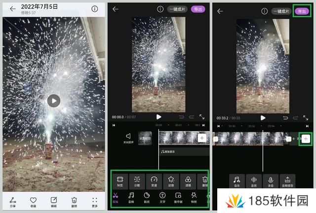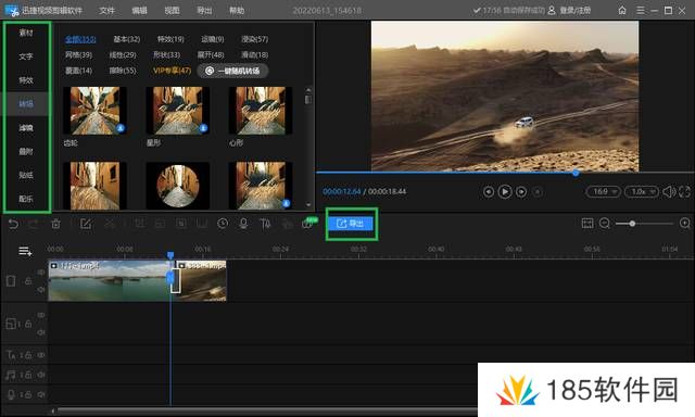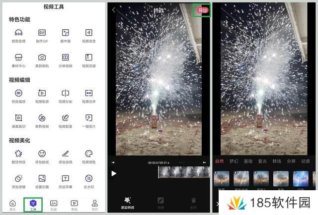 我们也能对图片添加文字、滤镜、特效等,同样是将特效拖动至时间轴使用,添加完成之后点击「导出」,视频剪辑就完成了。