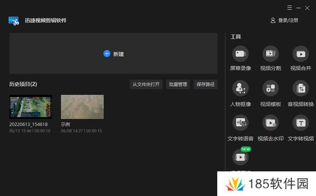 这款软件是一款功能较为齐全的电脑视频剪辑工具,支持视频分割、合并、屏幕录像以及文字转语音等多个功能,我们点击左上方新建可以导入视频剪辑。