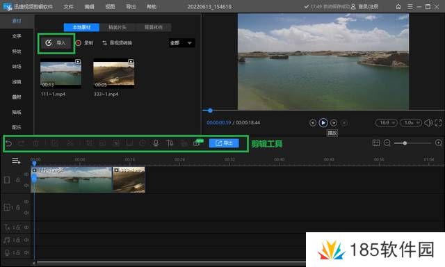 点击导入可以将多个视频导入,将视频拖动到时间轴上则可以进行编辑,多个视频拖动至时间轴则可以合并播放,利用剪辑工具可以对视频进行分割、裁剪、缩放以及添加马赛克等操作。