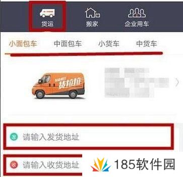 3、如果要“ 货运 ”,那么需要先选择车型,再输入发货地址和收货地址。