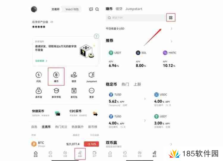 1、登录欧易APP(点击注册),点击首页【赚币】按钮,或者【金融】栏,并点击赚币页面右上角按钮