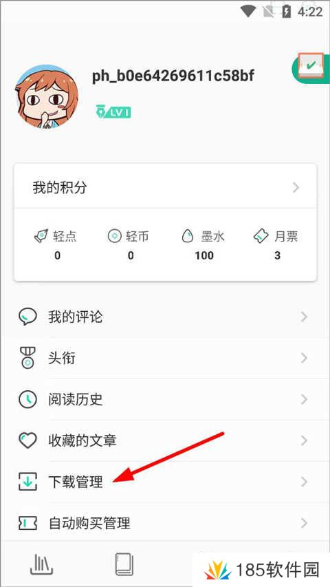 6、文章下载后可打开个人中心页面,用户可查看阅读历史、收藏文章等,点击下载管理;
