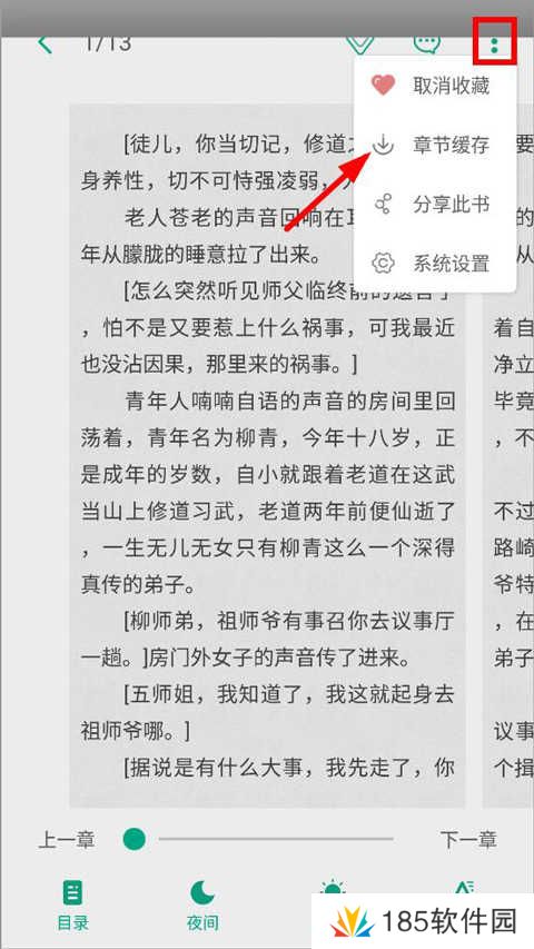 5、也可进入正文页面,单击屏幕,点击右上角“...”,下拉选择章节缓存;