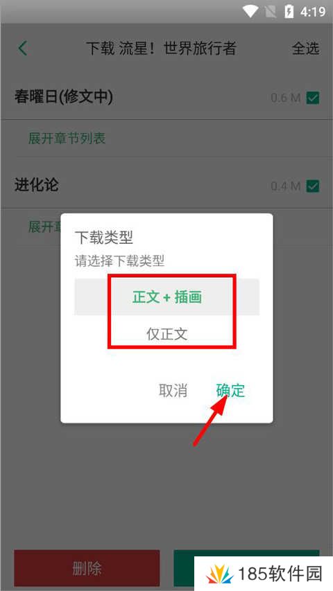4、选择下载类型(正文+插画、伪正文),点击确定;
