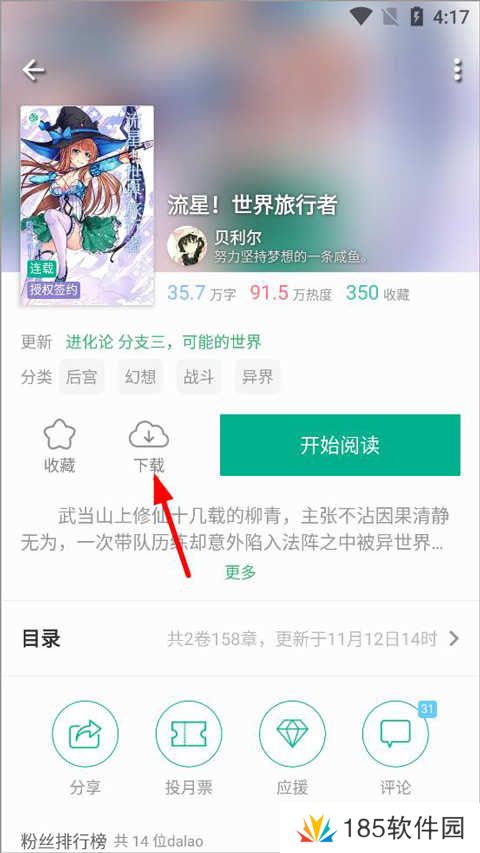 2、进入小说主页面,用户可收藏、阅读、分享、评论小说,点击阅读键旁边的下载按钮;