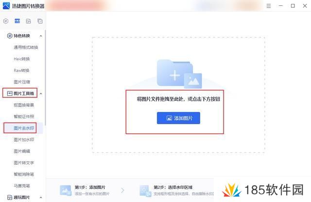 第一步:打开软件后,点击【图片工具箱】下的【图片去水印】功能,接着使用【添加图片】将需要去除水印的图片添加进软件中。