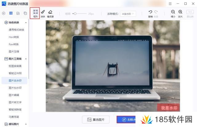 第二步:选择选择左上角的【矩形】,然后框选需要去除水印的区域,接着点击【去除水印】,软件就会自动进行水印去除了。