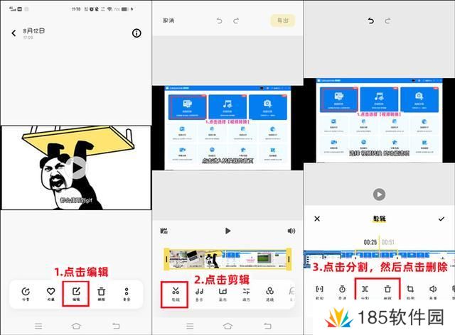 我们打开手机相册中需要剪辑的视频片段,点击【编辑】-【剪辑】选项,就进入到视频简洁页面了。我们播放视频到需要剪辑的位置暂停,点击【分割】,分割好之后,我们直接点击【删除】即可删掉中间不要的部分。