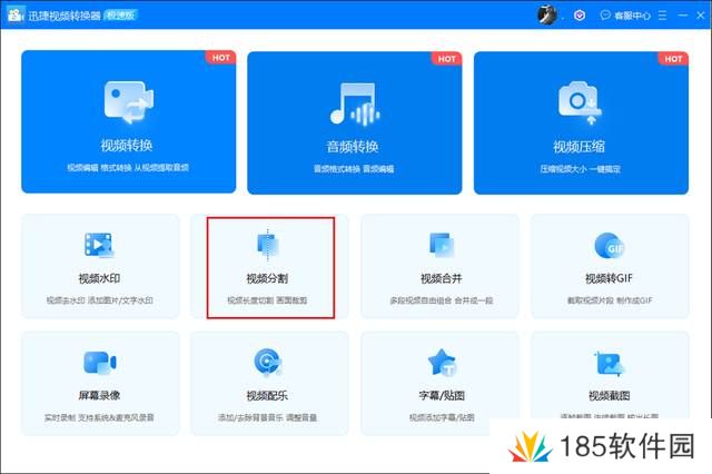 首先打开电脑上的“迅捷视频转换器”,看到软件·的第二行第二列的“视频分割”选项,点击选择。