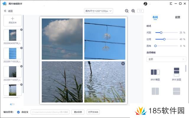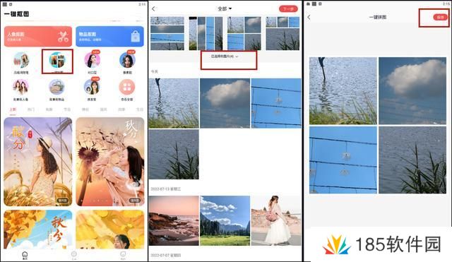 首先,我们选中几张需要拼接的图片,选择好之后,点击“创作”-“拼图”操作,即可进入到图片编辑的页面。在简约、自由、海报和拼接里面选择一个合适的风格进行拼接操作。拼接好的图片点击右上角即可保存。