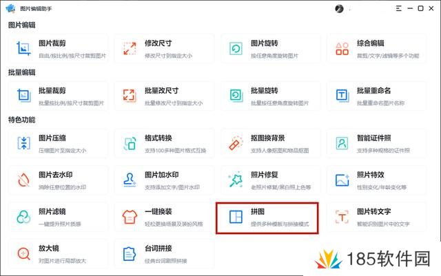 第一步 打开软件,找到“特色功能”里面的“拼图”操作,并且上传需要拼接的图片。