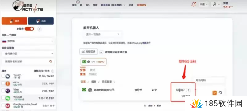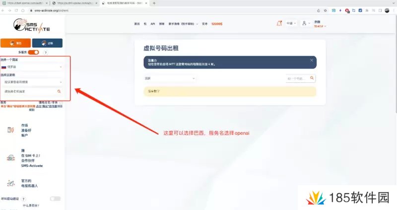 9、可以去租借虚拟号码,选择巴西,服务名选择[openai]。