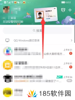 2、在顶部头像一栏右侧会看到QQ学生卡的入口。