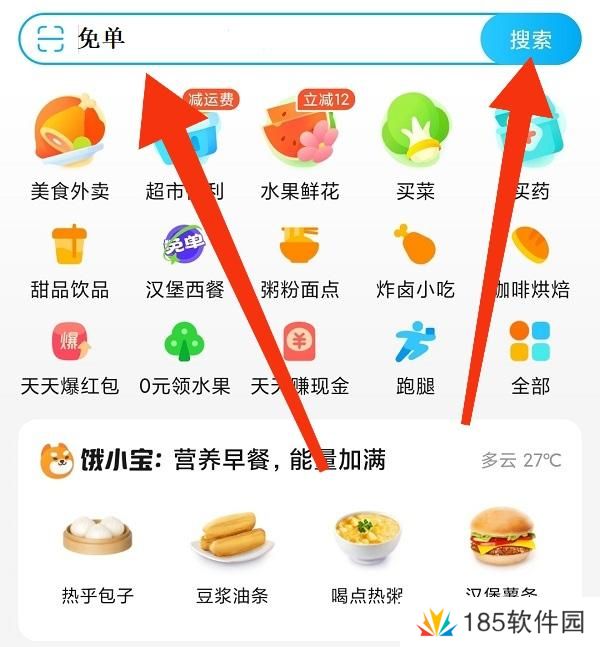 1、在饿了么app首页搜索框中输入“免单”然后点击搜索,即可进入今日饿了么免单活动界面。